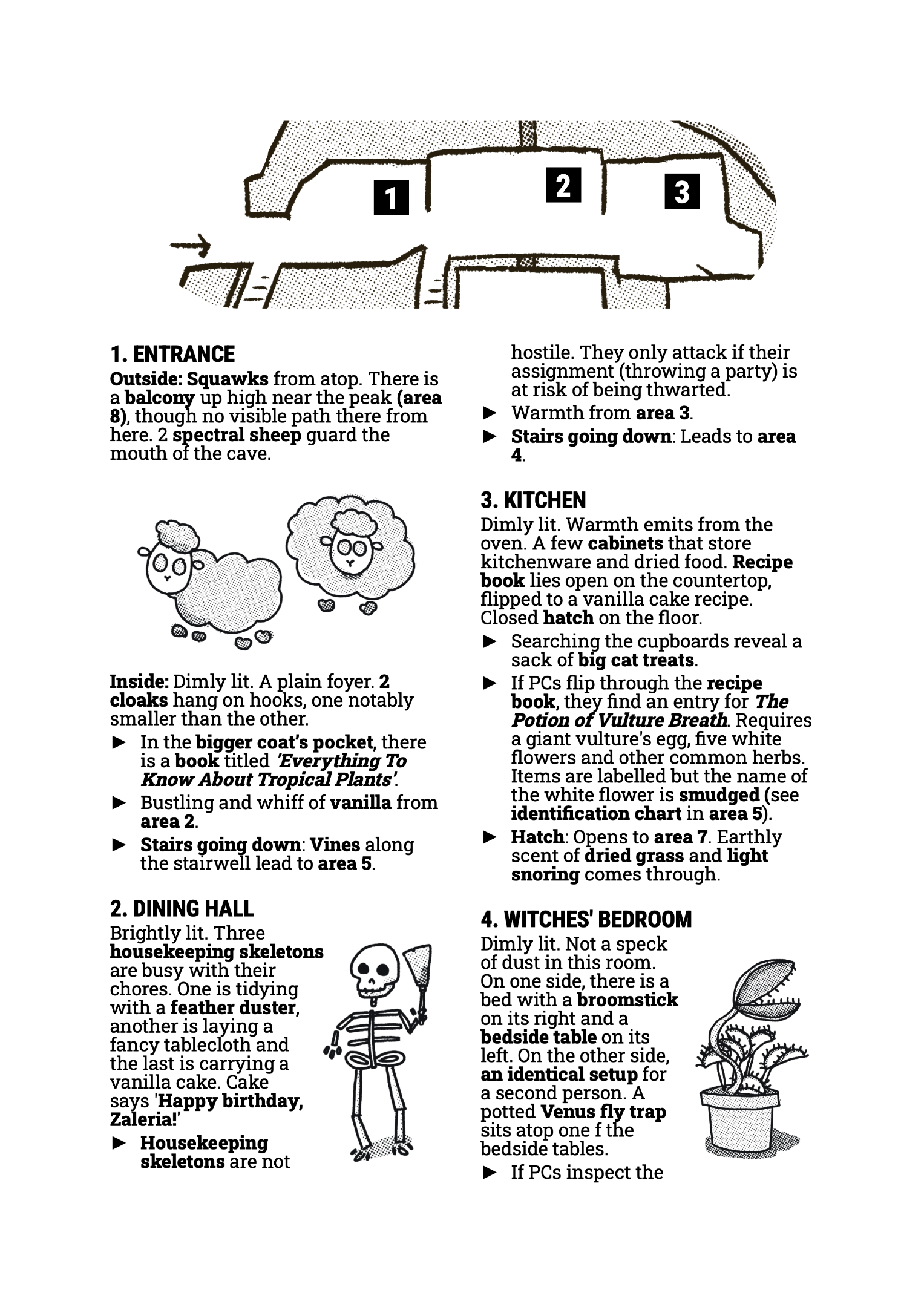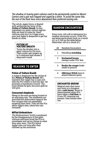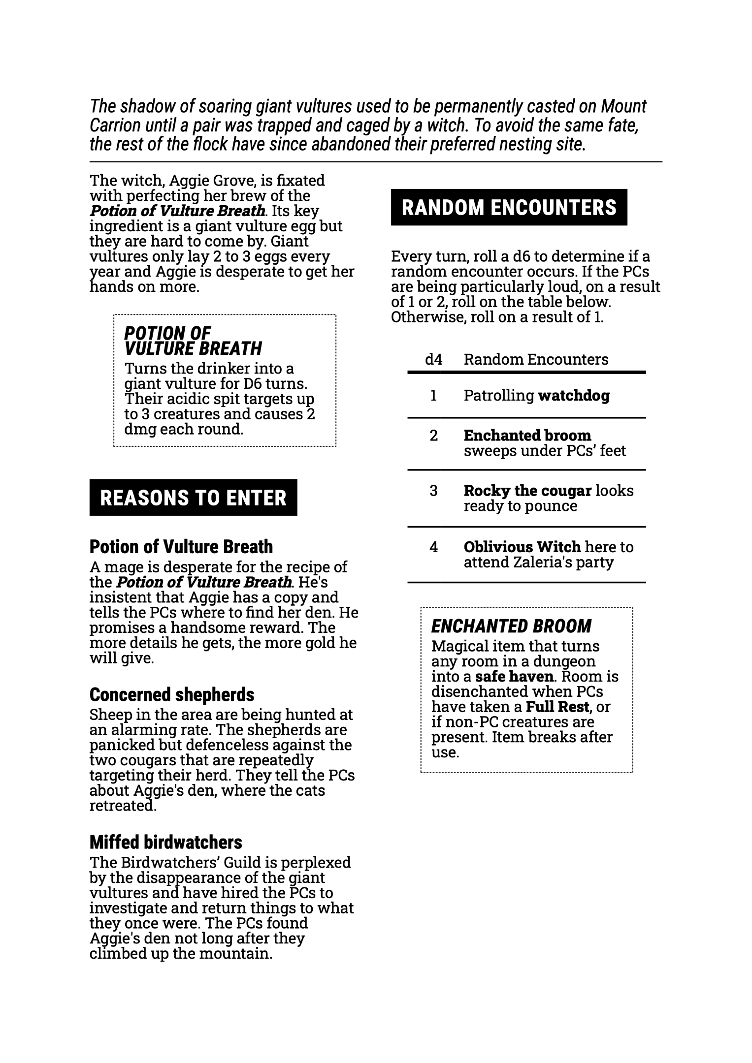 Caged in the Cliffs of Mount Carrion is a one-shot module for a party of low Hit Die (HD) adventurers. It is written for DURF as part of the DURF Jam 2025, but can easily be adapted for other old school inspired TTRPGs.